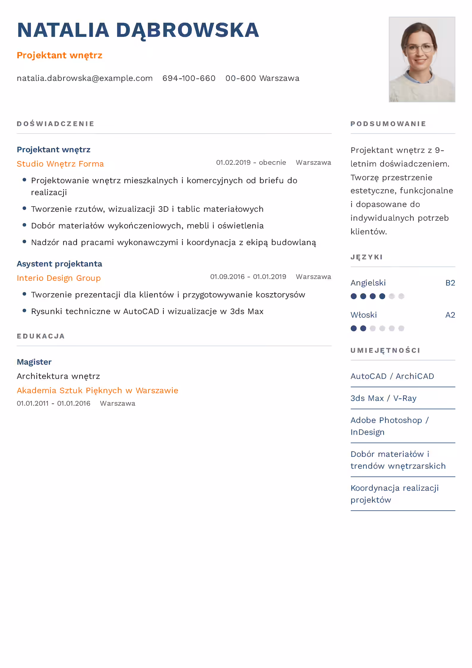 Jeżeli chcesz dobrze nazwać swoje zadania, pomocny będzie poradnik o tym, jak opisać obowiązki w CV, żeby przyciągnąć rekrutera. W przypadku projektanta wnętrz warto także pokazać, że potrafisz łączyć estetykę z techniką i odpowiedzialnością za końcowy efekt.